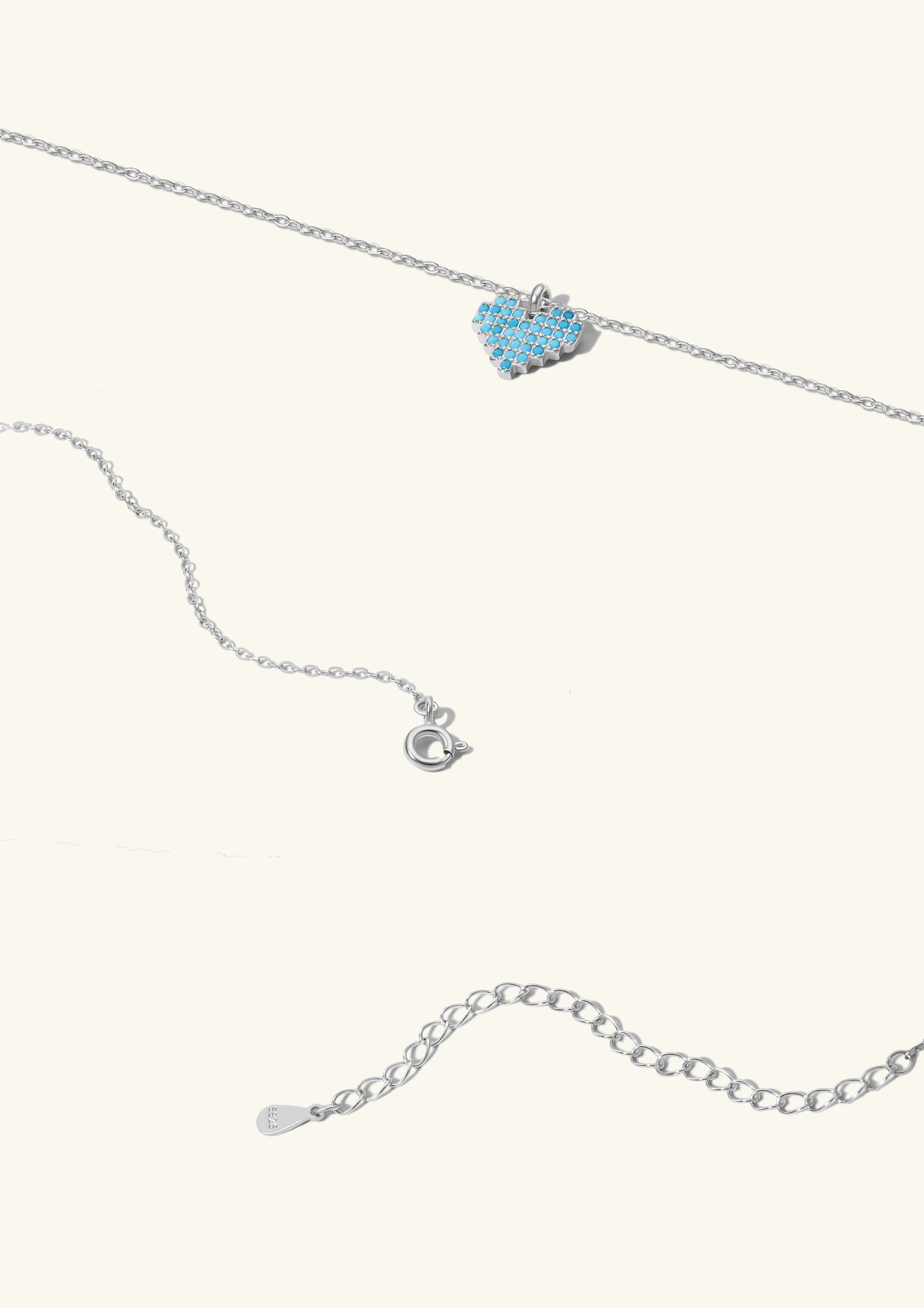 This stunning jewelry piece features a heart-shaped pendant inlaid with vivid synthetic turquoise and glittering synthetic cubic zirconia.