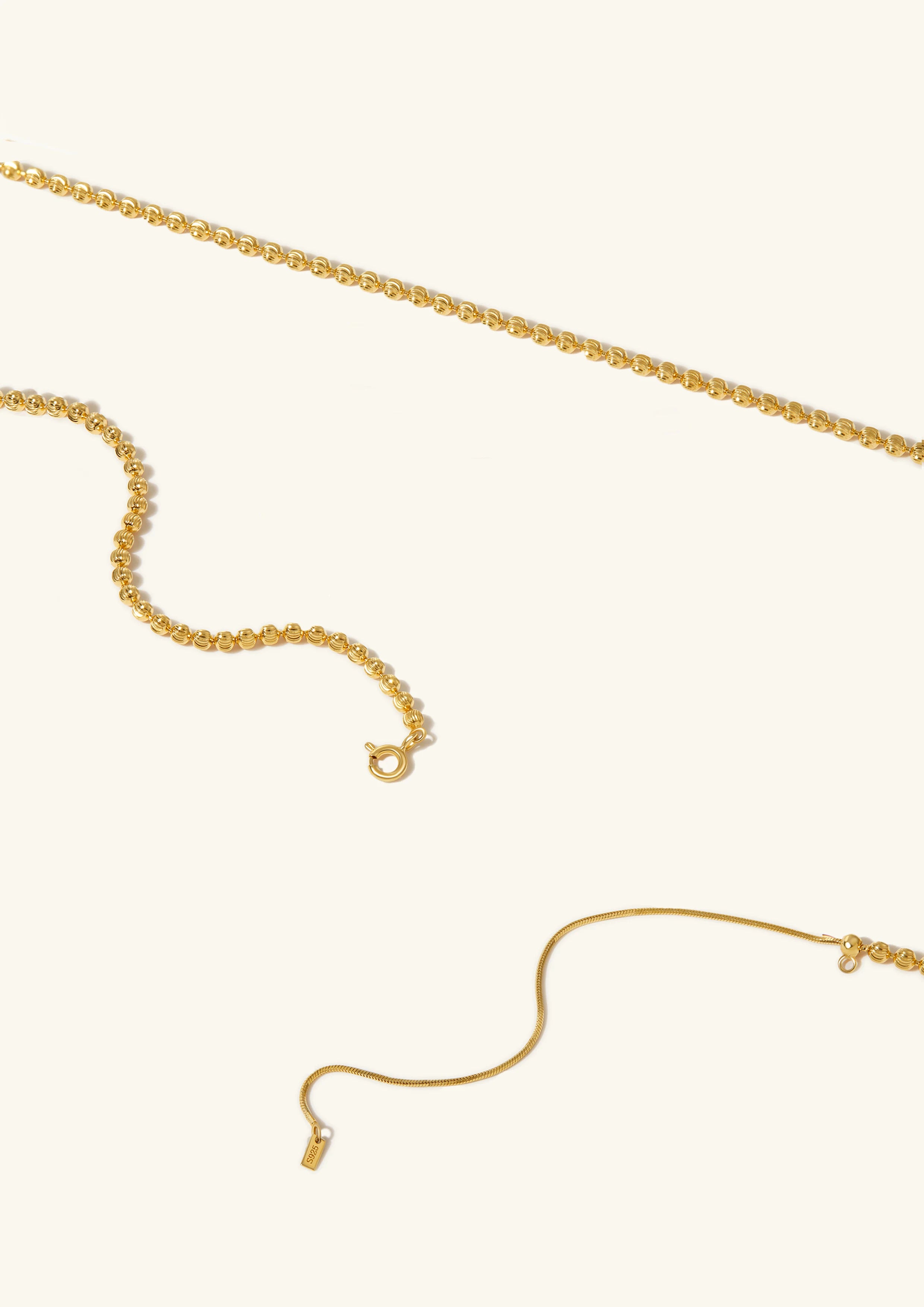 This necklace features a classic beaded design, adorned with a series of small, uniformly sized gold beads that shimmer beautifully and catch the eye effortlessly. With its sleek, sophisticated silhouette and elegant texture, it is an incredibly versatile piece: when worn alone, it exudes an understated yet refined charm; when layered with other necklaces, it creates a more striking, multi-dimensional look. No matter the outfit, it adds a touch of timeless glamour to the overall ensemble.