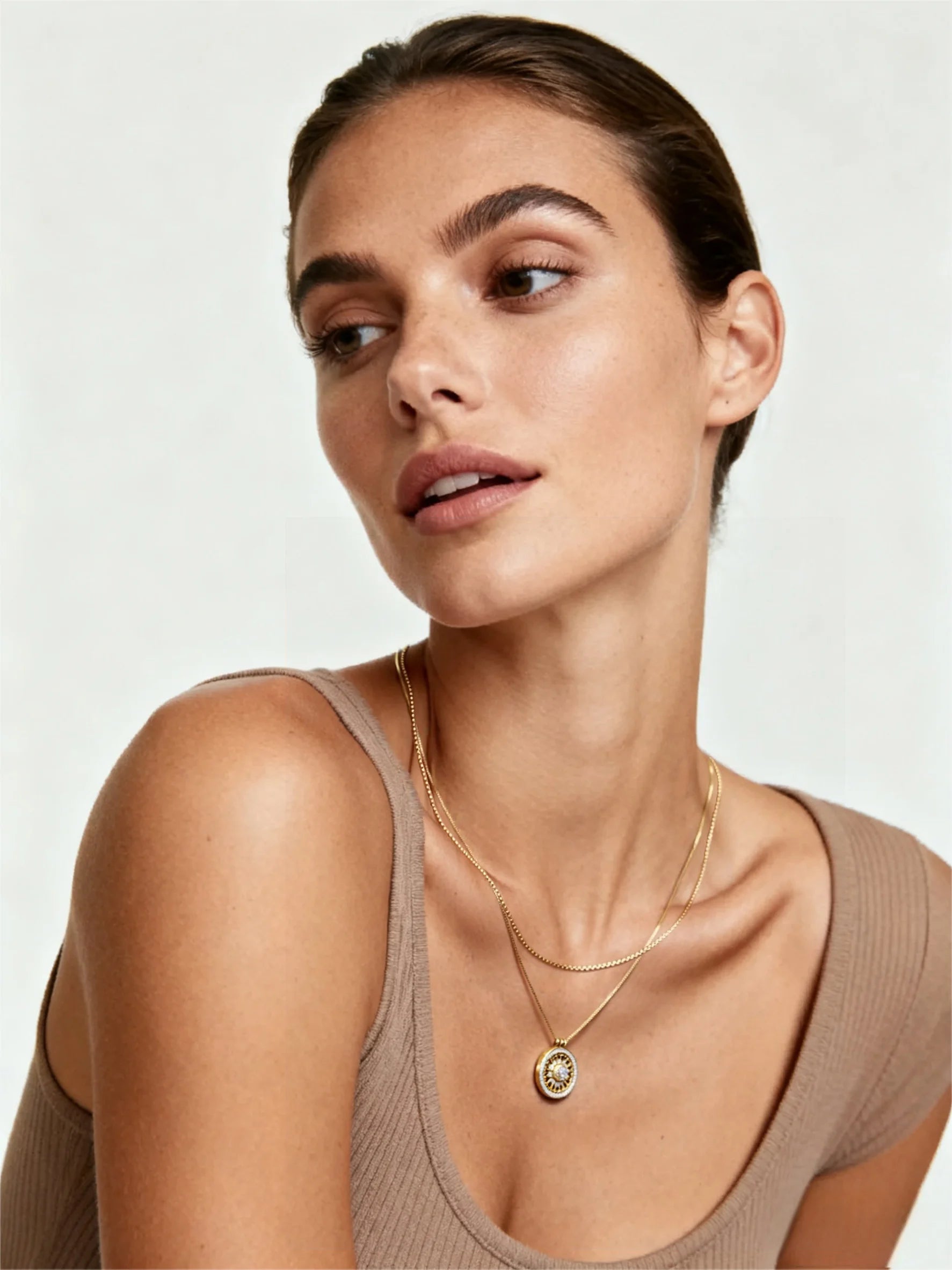This exquisite compass-inspired pendant necklace is crafted from 925 silver and plated with 18K gold, radiating elegance and sophistication. The intricate compass design, adorned with sparkling cubic zirconia, symbolizes guidance and adventure. Suspended from a sturdy and stylish Figaro chain, this necklace is perfect for adding a touch of nautical charm and symbolic meaning to any outfit. Elevate your jewelry collection with this unique and captivating piece.