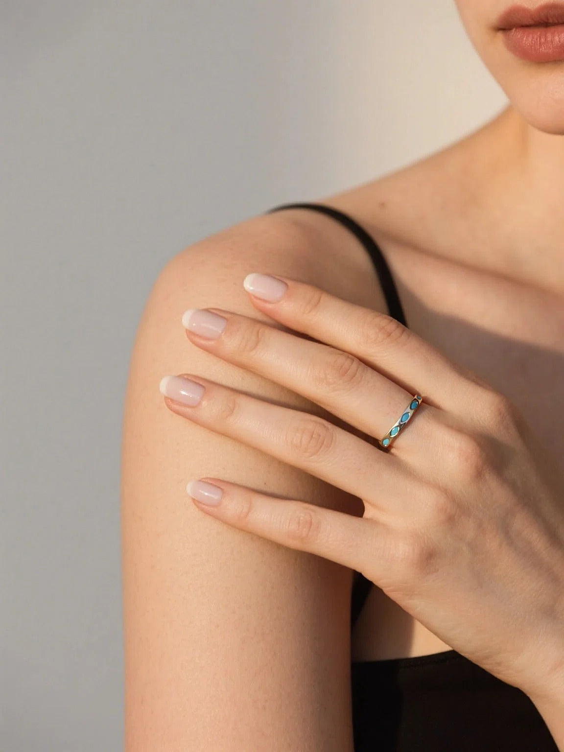 This 925 sterling silver ring features a minimalist and stylish design. The band is inlaid with synthetic turquoise decorations in "dopamine colors" — hues that are fresh and bright, adding a touch of vibrancy and delicacy to the overall piece. It is suitable for daily wear or matching with various outfits.