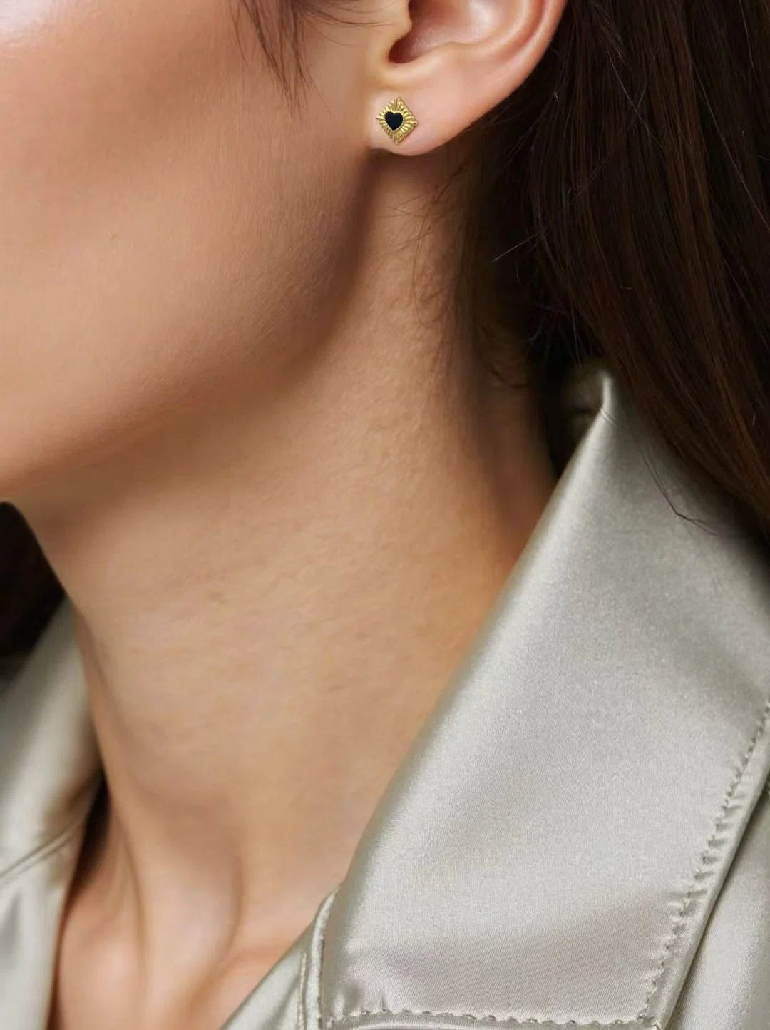 Crafted with an elegant square as the base shape, this pair of stud earrings features a black heart motif in the center, surrounded by delicate golden patterns that resemble radiating rays of light. The classic combination of black and gold exudes a sense of minimalist sophistication without compromising on style. With their dainty size, they are suitable for wearing on various occasions and can add a striking yet subtle detail to any outfit.